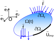 Nous considérons un domaine \(\Omega\) de frontière \(\partial \Omega\) soumis à des forces de volume \(\overrightarrow{f}\) et des forces de surface \(\overrightarrow{F}\) sur une partie \(\partial \Omega_F\) de la frontière. La partie restante de la frontière est soumise à des déplacements imposés \(\overrightarrow{U}_0\) sur \(\partial \Omega_U\) (avec \(\partial \Omega = \partial \Omega_ \cup \partial \Omega_F\) et \(\partial \Omega_U \cap \partial \Omega_F = \emptyset\)). Le problème d’élasticité linéaire consiste à trouver le champ de déplacement \(\overrightarrow{u}\) vérifiant :