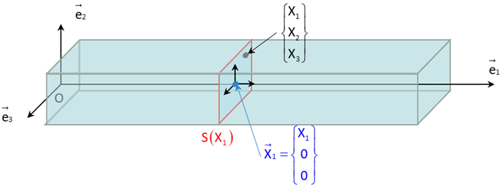 Comme illustré Figure 1.1, on note \(S(X_1)\) la section droite d’abscisse \(X_1\). Dans la configuration déformée (Figure 1.2), on définit