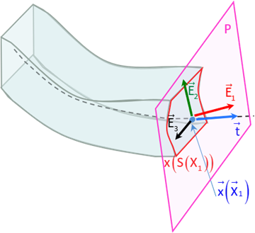 Le déplacement de la section droite peut être représenté par un vecteur translation (par exemple \(\overrightarrow {u}(X_1,0,0)\), noté \(\overrightarrow {u}^f(X_1)\) et par un vecteur rotation (par exemple le vecteur rotation \(\overrightarrow {\omega}(X_1)\) du repère \((\overrightarrow {x}(X_1),\overrightarrow {E}_1(X_1),\overrightarrow {E}_2(X_1),\overrightarrow {E}_3(X_1))\) par rapport au repère \((O,\overrightarrow {e}_1,\overrightarrow {e}_2, \overrightarrow {e}_3)\).