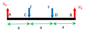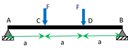 On considère une poutre droite rectiligne de section constante reposant sans frottement sur 2 appuis simples en \(A\) et \(B\) et supportant deux charges concentrées \(F\) en \(C\) et \(D\), comme représenté sur Figure 9.3.