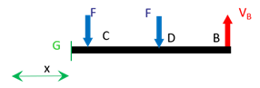 Plaçons nous maintenant en une section \(G\) dans le tronçon de poutre \(CD\) à une distance \(x\) de \(A\).