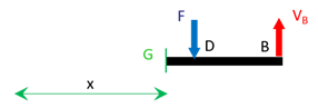 Plaçons nous enfin en une section \(G\) dans le tronçon de poutre \(DB\) à une distance \(x\) de \(C\). On considère les forces et moments en \(G\) exercés par la partie droite de la poutre. On note \(\overrightarrow{T}_{DB}\) et \(\overrightarrow{M}_{DB}\) ces contraintes généralisées.