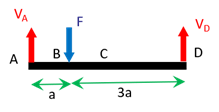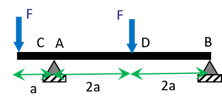 On considère une poutre droite rectiligne, de longueur \(4a\), de section constante reposant sans frottement sur 2 appuis simples en \(A\) et \(D\) et supportant une charge concentrée \(F\) en \(C\) (à une distance \(a\) de l’extrémité \(A\)), comme représenté sur Figure 9.6.
