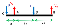 Soit \(\overrightarrow{T}_{AC}\,=\,\left\{ \begin{array}{c} 0 \\ - F - F + V_B \\ 0 \end{array} \right\}\,=\,\left\{ \begin{array}{c} 0 \\ - F \\ 0 \end{array} \right\}\) et \(\overrightarrow{M}_{AC}\,=\,\left\{ \begin{array}{c} 0 \\ 0 \\ (x-a) F + (x-2a)F + (3a-x)V_B \end{array} \right\}\,=\,\left\{ \begin{array}{c} 0 \\ 0 \\ F x \end{array} \right\}\).