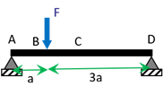 On considère une poutre droite rectiligne, de longueur \(4a\), de section constante reposant sans frottement sur 2 appuis simples en \(A\) et \(D\) et supportant une charge concentrée \(F\) en \(C\) (à une distance \(a\) de l’extrémité \(A\)), comme représenté sur Figure 9.5.