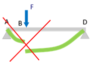 Par ailleurs, au point \(B\), en \(x=a\), nous devons avoir continuité du déplacement vertical et de la pente de la poutre déformée, ce qui se traduit par : \(\color{blue}{{u^f_2}_{AB}(a) = {u^f_2}_{BD}(a)}\) et \(\color{blue}{{u^f_{2,1}}_{AB}(a) = {u^f_{2,1}}_{BD}(a)}\).
