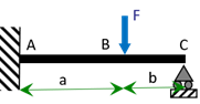 Jusqu’alors, nous n’avons étudié que des poutres formant des systèmes isostatiques, ou statiquement déterminés ; c’est-à-dire que nous pouvions déterminer les réactions à l’aide des seules équations du principe fondamental de la statique. Les réactions qui ne peuvent être calculées par les seules équations d’équilibre détermine le degré d’hyperstaticité d’un système. Considérons par exemple une poutre “console” de longueur \(a+b\), de section constante, encastrée en une extrémité \(A\), ayant un appui simple à l’autre extrémité en \(C\), soumise à une charge concentrée \(F\) en \(B\) à une distance \(a\) de \(A\), comme représenté ci-après.