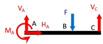 Chaque fois que l’on empêche un déplacement on a une force de réaction, chaque fois que l’on empêche une rotation on a un couple résistant. En \(A\), on a un encastrement. On empêche donc tout déplacement par une force de réaction \(\overrightarrow R_A=\left\{ \begin{array}{c}H_A \\V_A\\0 \end{array}\right\}\) et toute rotation par un moment de réaction \(\overrightarrow M_A=\left\{\begin{array}{c}0 \\0\\M_A \end{array}\right\}\). En \(C\), on a un appui simple, on empêche donc le déplacement vertical par une force de réaction \(\overrightarrow R_C=\left\{\begin{array}{c}0 \\V_C\\0 \end{array}\right\}\).