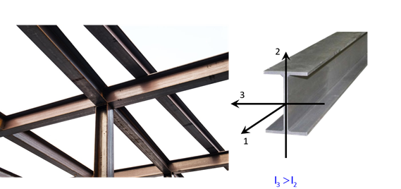 Au centre de la section de la poutre sollicitée en flexion pure plane, la contrainte est nulle. C’est pourquoi, en génie civil, on utilise des poutres en I ou en T pour lesquelles les fibres les plus éloignées de la fibre moyenne sont renforcées en matériau, tandis que le matériau au centre de la section est supprimé pour alléger la structure. Par ailleurs, en position correctement les axes de symétries de la section Figure 9.1, on s’assure que la flexion sollicite le plus grand moment quadratique afin de minimiser les contraintes.