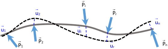 On considère une poutre soumise à un ensemble de forces ponctuelles \(\overrightarrow P_i\) appliquées en des points de la structure. On note \(\overrightarrow u_i\) le déplacement au point d’application de la force \(\overrightarrow P_i\).