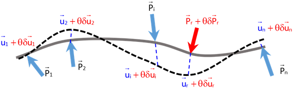 Augmentons donc la valeur la force ponctuelle \(\overrightarrow P_r\) , d’une quantité \(\theta \overrightarrow {\delta P}_r\). On constitue ainsi un système de forces \(II\). En chaque point d’application des forces on aura alors un déplacement \(\overrightarrow u_i + \theta \overrightarrow {\delta u}_i\).