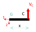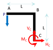 En \(C\) on a un encastrement, donc une force de réaction \(\overrightarrow{R}_{C}\,=\,\left\{ \begin{array}{c} H_C \\ V_C \\ 0 \end{array} \right\}\) et un couple résistant \(\overrightarrow{M}_{C}\,=\,\left\{ \begin{array}{c} 0 \\ 0 \\ M_C \end{array} \right\}\).
