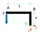 On note \(\Delta y_A\) le déplacement vertical du point \(A\).Par application du théorème du travail, on a : \[W \,=\,\displaystyle\frac{1}{2} \int \left( \displaystyle\frac{T^2_1}{ES} + \displaystyle\frac{T^2_2}{GS} + \displaystyle\frac{T^2_3}{GS} + \displaystyle\frac{M^2_1}{GI_1} + \displaystyle\frac{M^2_2}{EI_2} + \displaystyle\frac{M^2_3}{EI_3} \right) dX_1\; = \; \displaystyle\frac{1}{2} \sum_{i}{\overrightarrow F_i \cdot \overrightarrow u_i} = - \displaystyle\frac{1}{2}P \Delta y_A\] Il faut donc maintenant déterminer les contraintes généralisées en tout point de la poutre.