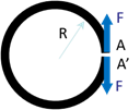 Un anneau circulaire fr rayon \(R\) est fendu radialement. En l’absence de forces extérieures, la largeur de la fente est très petite. On applique de chaque côté de la fente deux forces égales directement opposées. Déterminer, par le théorème du travail, l’ouverture \(\delta\) de la fente quand l’intensité des forces devient égale \(F\).