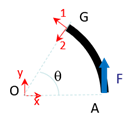 On se place en une section \(G\) quelconque. En « regardant » d’un côté ou de l’autre de \(G\), on trouve facilement que \(\pm \overrightarrow T = \overrightarrow F\) et \(\pm \overrightarrow M = \overrightarrow{GA} \wedge \overrightarrow F\). Dans le repère local à la poutre, on a donc : \[\pm \overrightarrow T = \left\{ \begin{array}{c} F \cos \theta \\ - F \sin \theta \\ 0 \end{array} \right\}\] Pour calculer le moment, on peut rester dans le repère \((0,x,y,z)\) comme seule la troisième composante est non nulle : \[\pm \overrightarrow M = \overrightarrow{GA} \wedge \overrightarrow F = \left\{ \begin{array}{c} R - R \cos \theta \\ - R \sin \theta \\ 0 \end{array} \right\} \wedge \left\{ \begin{array}{c} 0 \\ F \\ 0 \end{array} \right\} = \left\{ \begin{array}{c} 0 \\ 0 \\ F R (1-\cos \theta) \end{array} \right\}\] On peut maintenant calculer l’énergie de déformation. On a : \[W \,=\, \int_0^{\Pi} \left( \displaystyle\frac{F^2 \cos^2 \theta}{ES} + \displaystyle\frac{F^2 \sin^2 \theta}{GS} + \displaystyle\frac{F^2 R^2 (1-\cos \theta)^2}{EI_3} \right) R d\theta\]