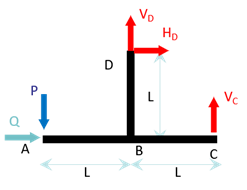 Pour finir on doit évaluer cette expression pour \(Q=0\). Si on applique le PFS avec \(Q=0\), on trouve : \(H_D=0\), \(V_D=2P\) et \(V_C=-P\). D’où finalement :
